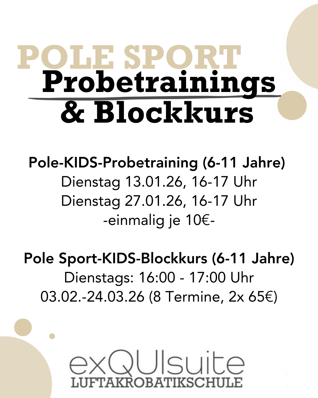 Dienstags: 16-17 Uhr Pole Probetraining (6-11 Jahre) 13.01.2026, 27.01.2026 (je Kind/ Termin 10€)